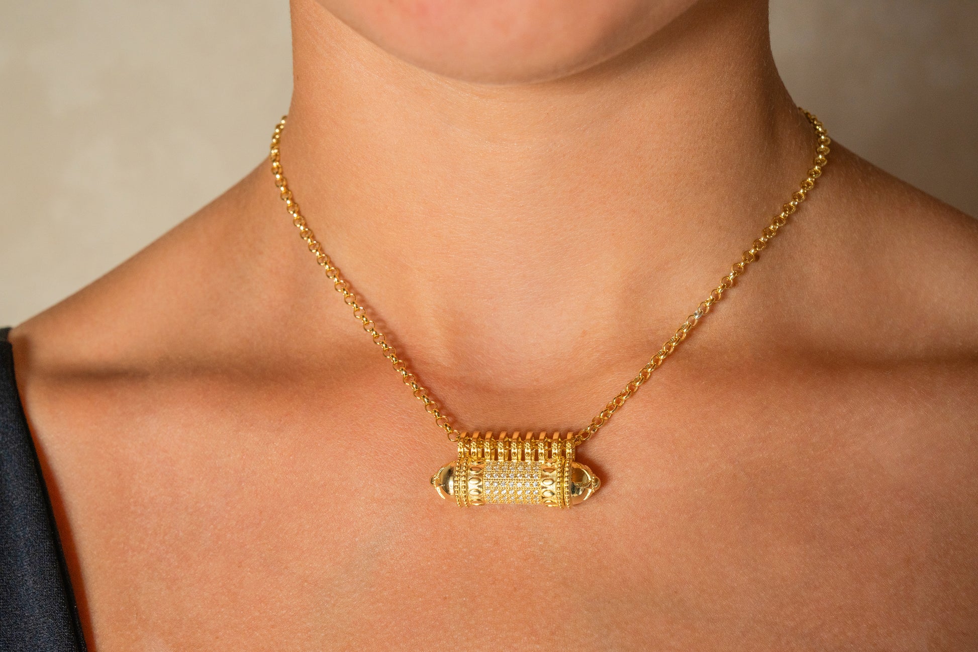 The Antique Pavé Style Kavacha showcases the designer’s dedication to timeless elegance and refined craftsmanship. This updated version of the original design removes the lion motif (Narashimha Dev), allowing the intricate details to shine. Rows of pavé diamonds add a touch of luxury, while the patina finish enhances its antique allure. Designed for those who appreciate understated beauty, this piece seamlessly combines classic sophistication with modern versatility.